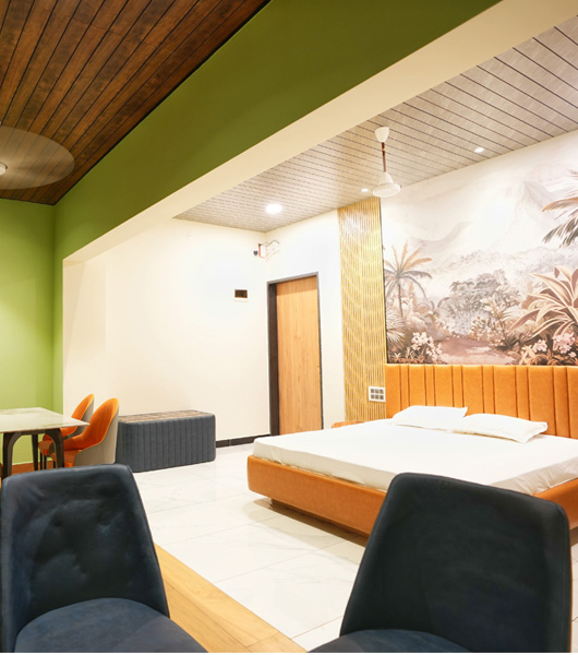 The property offers two 1BHK rooms—Suite 101 and Suite 201—each designed for comfort and privacy, making it a perfect choice for families and longer stays. The unit features one bedroom with a king-size bed, a cozy living room with a sofa-cum-bed, and a dedicated dining space for relaxed meals together. An extra floor mattress can be provided to comfortably accommodate additional guests.